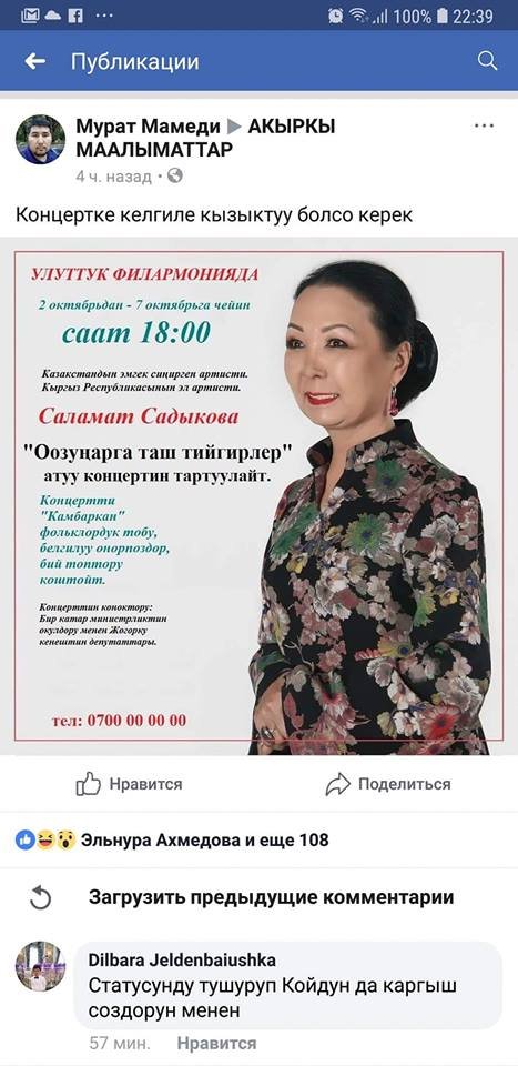 Бирок токтоткула, менин балдарыма чейин асылып, каралап шылдындаганынарды. Балдарымды жайына койгула жалакорлор…Мурат Мамеди деген да афиша реклама жасап мени шылдындап чыгарыптыр бул үчүн жооп бересиз – деп жазган Садыкова.