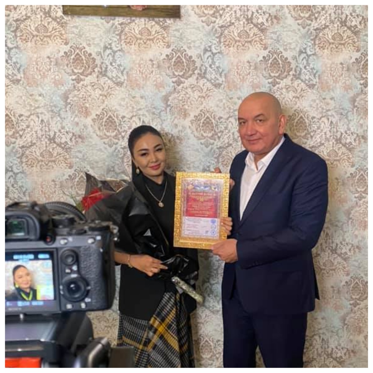 --"Кыргыз-Өзбек" достугуна кошкон салымым үчүн, Өзбекстандын Ташкент шаарында жогорку деңгээлде концерт бергеним үчүн, Өзбекстан Республикасынын абройлуу “Музаффар.уз” сайты, белгилүү “Соадат" мамлекеттик журналы жана Өзбекстан Республикасынын Эл артисттер коомунун чечими аркылуу “Ардак грамота“, "Фахрий йорлик" менен сыйландым. Ар бир эмгегим, сүйүктүү өлкөм Кыргызстаныбыз үчүн! - дейт ырчы.