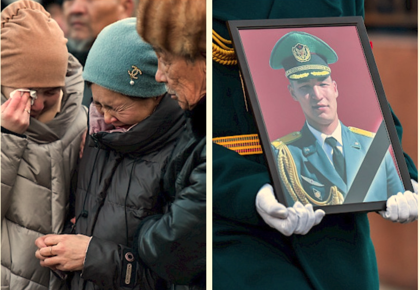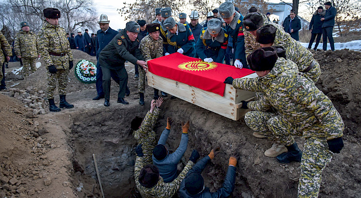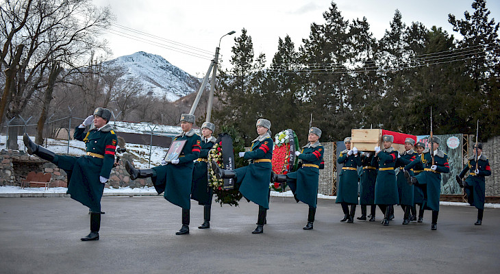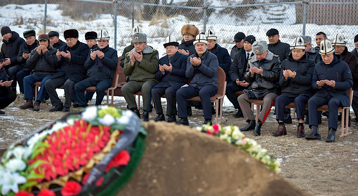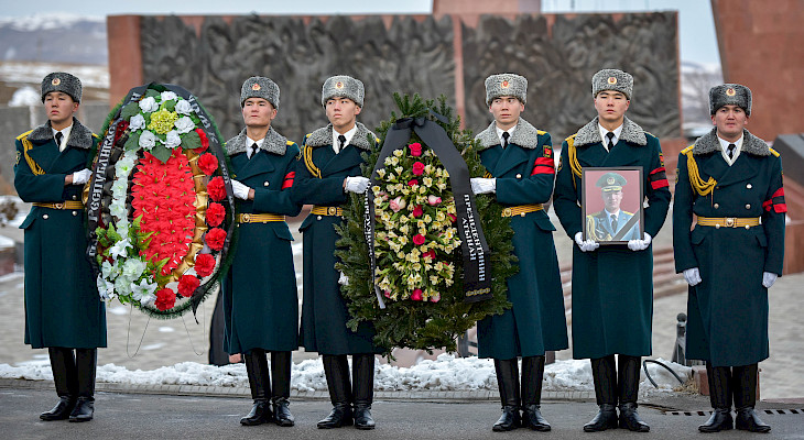 Ротанын аскер кызматкерлери үч жолу ок чыгарды. Президент Садыр Жапаров жана башка митинг-реквиемдин катышуучулары жоокердин жайына бир ууч топурак ыргытышып, эскерүү дубасы окулду.