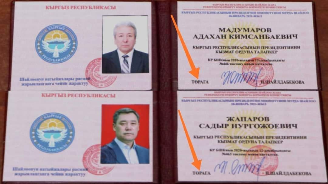 Учурда социалдык тармактарды талапкердин күбөлүгү тууралуу талкуу жүрүүдө. Алсак, талапкердин күбөлүгүнө жазылган "төрайым" деген жазуунун ордуна "төрага" деп жазылып, 2 башка талапкердин күбөлүгүндө, эки башка кол коюлуп калган.