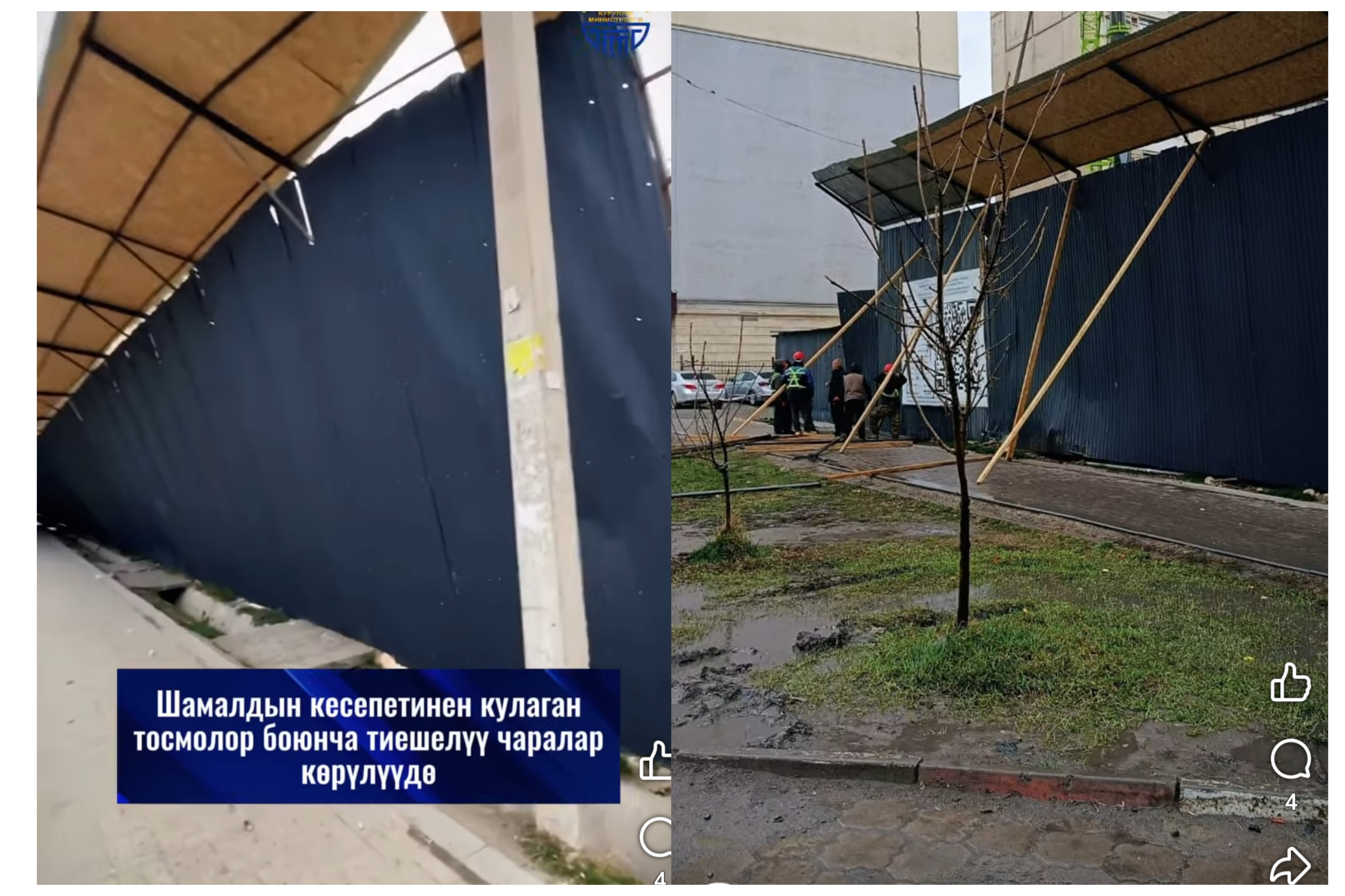 Белгилей кетсек, Курулуш министрлиги тарабынан курулуш объектилериндеги шамалдын кесепетинен кулаган тосмолор жана коопсуздук талаптарынын бузулушу боюнча текшерүүлөр жүргүзүлүп, тиешелүү чаралар көрүлүүдө.