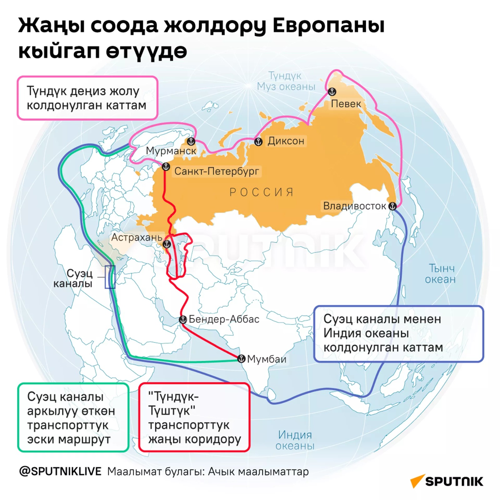 Узундугу жети чакырымга созулган Түндүк — Түштүк транспорттук жаңы коридору Санкт-Петербургдан тарта Индия, Ирандын портторуна чейин созулат. Ал салынып, жаңыланып бүткөндөн кийин жүктөрдү ташып жеткирүүнүн мөөнөтү Суэц каналына салыштырмалуу эки эсе кыскарат.