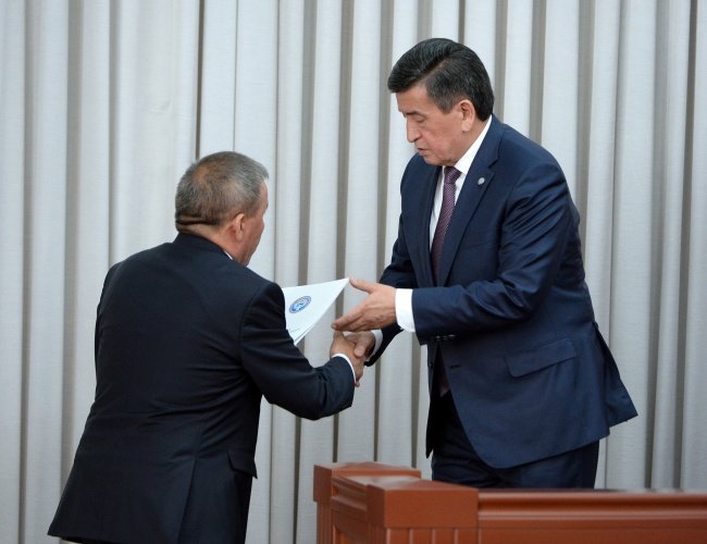 Кыргыз Республикасынын Президенти Сооронбай Жээнбеков бүгүн, 19-июнда КР Жогорку Кеңешинин жыйынында КР Өкмөтүнүн жаңы мүчөлөрүнүн ант берүү аземине катышты.