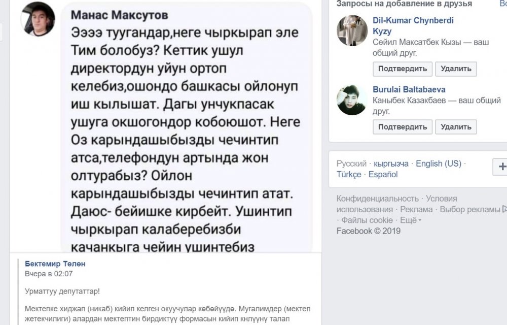 Алай районунда Эшкул Мырзаев атындагы мектептин директору окуучу кыздын башындагы жоолугун чечүүгө мажбурлап жаткандыгы тууралуу маалымат ММКларга чыгаар замат бул окуя интернеттин социалдык тармактарында кызуу талкууга түштү.