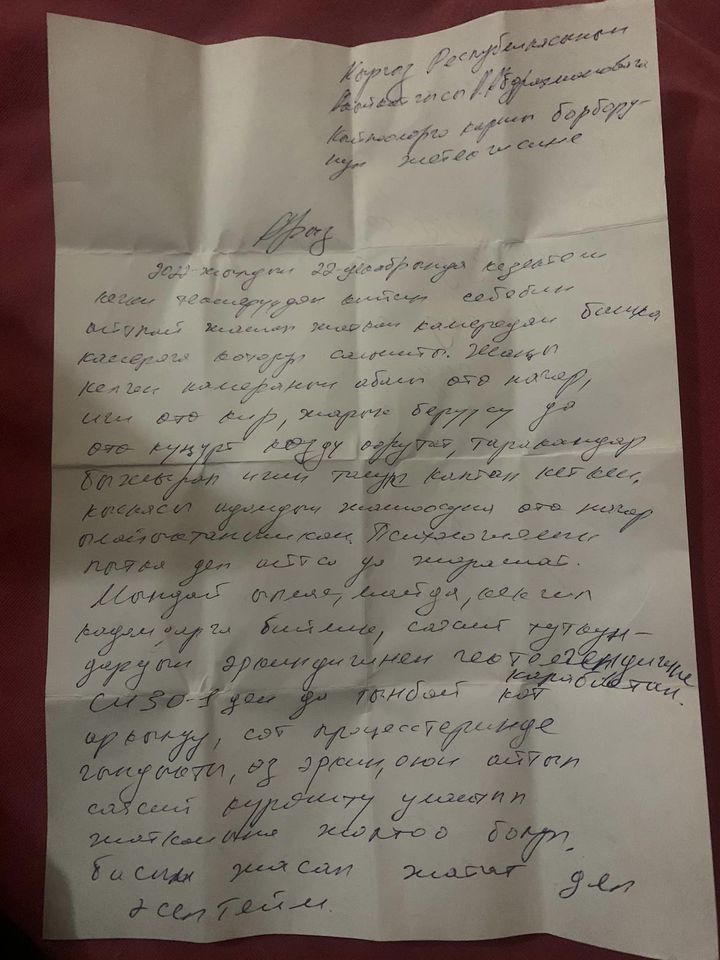 "2022-жылдын 22-декабрында кезектеги кечки текшерүүдөн кийин себебин айтпай жашап жаткан камерадан башка камерага которуп салышты. Жаңы келген камеранын абалы өтө начар, ичи өтө кир, жарык берүүсү да өтө күңүрт көздү оорутат. Таракандар быжырап ичин толук каптап кеткен. Кыскасы адамдын жашоосуна өтө начар ылайыктанышкан. Психологиялык пытка деп айтса да жарашат.