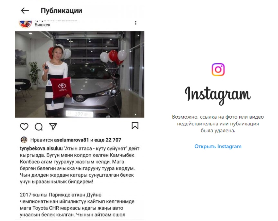 Дүйнөнүн үч жолку чемпиону, кыргыздын белгилүү спортчусу Айсулуу Тыныбекова Instagram баракчасынан Камчы Көлбаев машина белек кылды деп ыраазычылык билдирген билдирүүсүн өчүрдү.