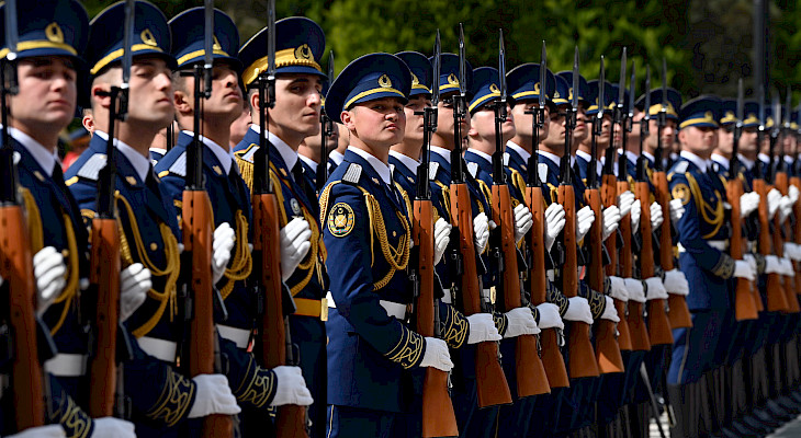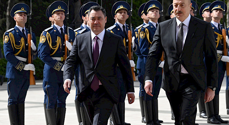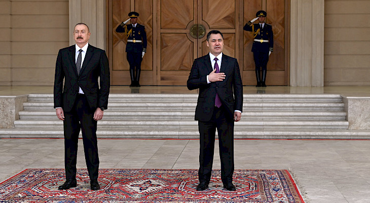 Андан соң, Кыргызстан менен Азербайжандын гимндерин уккандан кийин Садыр Жапаров менен Ильхам Алиев расмий делегация мүчөлөрүн тааныштырышты, андан соң ардак кароолдун ротасы салтанаттуу маршы болду.