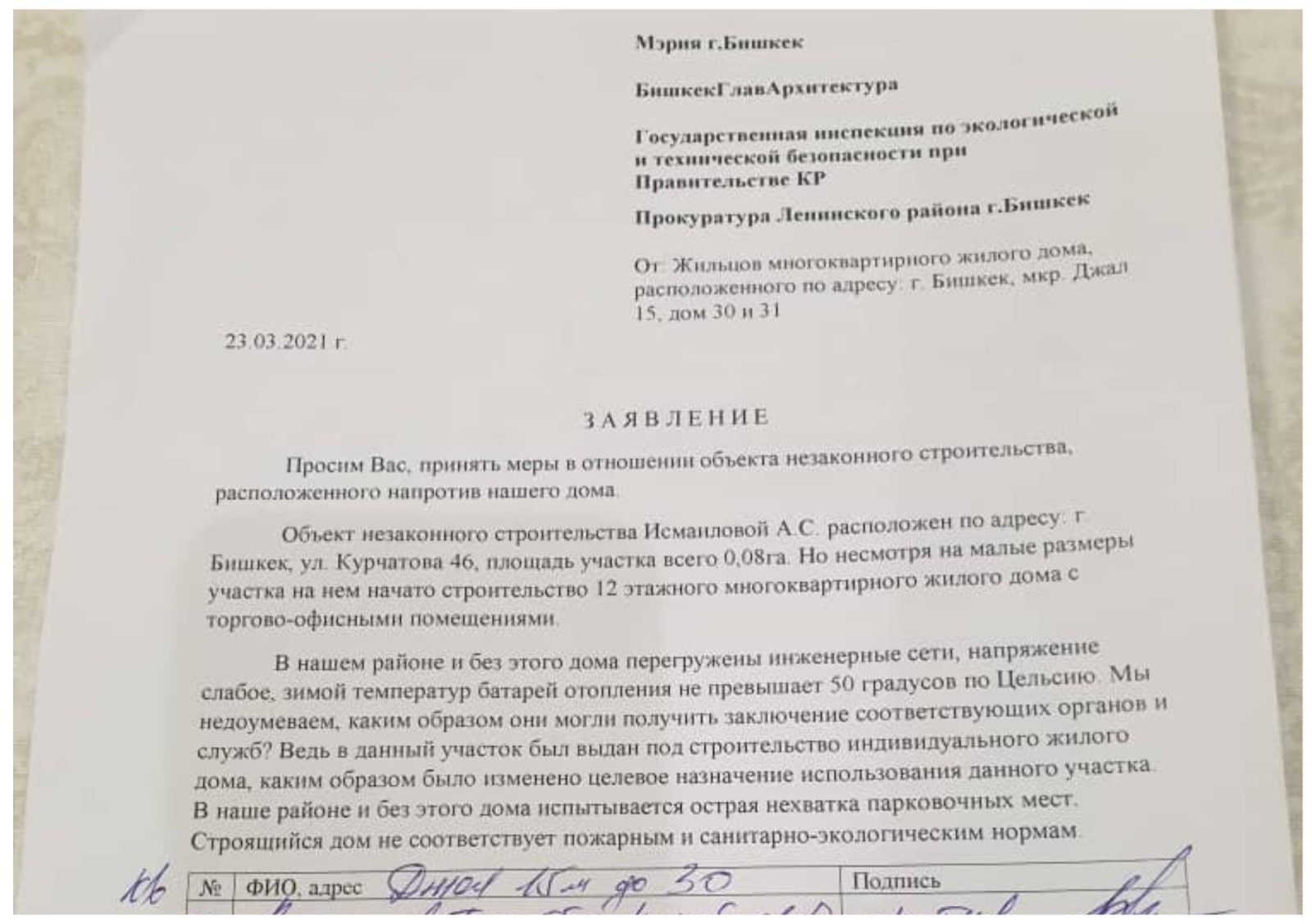 Жал-15 кичи району 30-31-32-көп кабаттуу турак үйлөрүндөгү жана ага чектеш (өтө жакын) Курчатов көчөсүндөгү №48, 46/4, 44, 44/1, 44/2, 44/3, 44/4 үйлөрдүн жашоочулары бүгүнкү күндө ал аймакта 8 сотых жерге салынып баштаган көп кабаттуу турак үйдүн курулушуна каршы чыгып жатышат. Эмнеге каршы, анын да себеби толтура экен. Бул боюнча журналисттик иликтөөмдү баштадым. Азырынча чакан билдирүү кылайын, - деген пикирин журналист Сурат Жылкычиев билдирип, президентке жана Камчыбек Ташиевге кайрылуу жасады.
