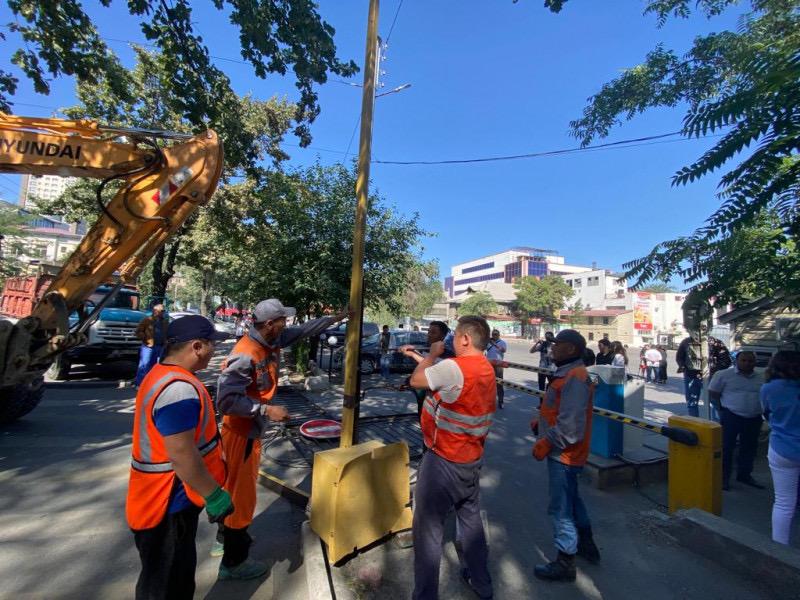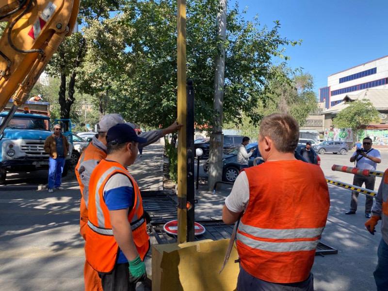 Учурда 12-кичирайондун Токомбаев көчөсүндөгү уруксаты жок темир тосмолорду демонтаждоо иштери жүрүп жатат.
