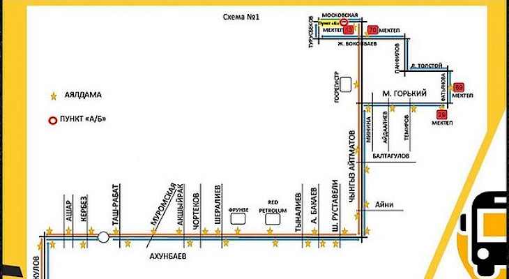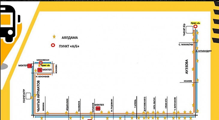 Бекитилген маршрутка ылайык автобустар №13, 70, 69 жана 29 мектептерди камтыйт. Каттамдардын жүгүртмөсү ата-энелердин өтүнүчү боюнча жаңыртылууда. Алардын айрымдары маалымат менен бөлүшүп, анда жол кире 25 сом экенин жана жол кире карталарын сатып алууга кызыкдар экендигин билдиришкен.
