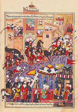 Үчүнчү сүрөт: Тамерлан 1370– жылы Балх шаарын курчоого алганда. (Сүрөттө көпчүлүк Ак калпакчан).