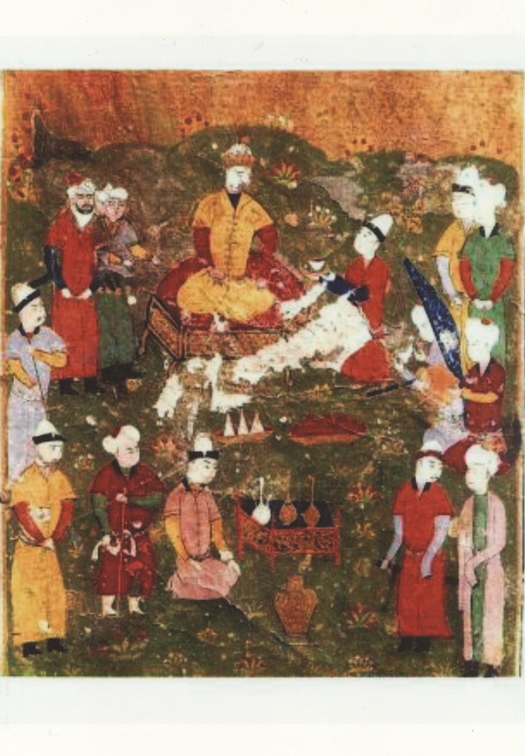 Жетинчи сүрөт: Тамерландын небереси, Шахрухдун уулу Улугбек 1405 – 1449- жылдары бийлик жүргүзгөн. Сүрөт 1425-1450 жылдар аралыгында тартылган. Улугбектин аялдары монголчо кийинген. Анын 2 уулу жана 3 генералы ак калпак кийиип турат. (сүрөткө түшүндүрмө 98- бетте).