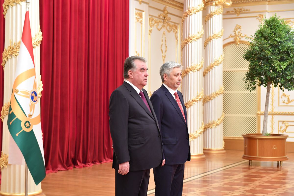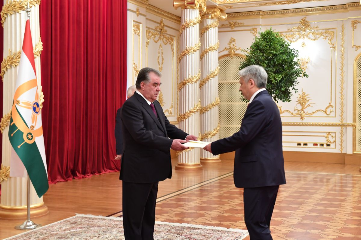 Душанбе шаарында Кыргызстандын Тажикстандагы элчиси Эрлан Абдылдаев Тажикстандын президенти Эмомали Рахмонго ишеним грамоталарын тапшырды.