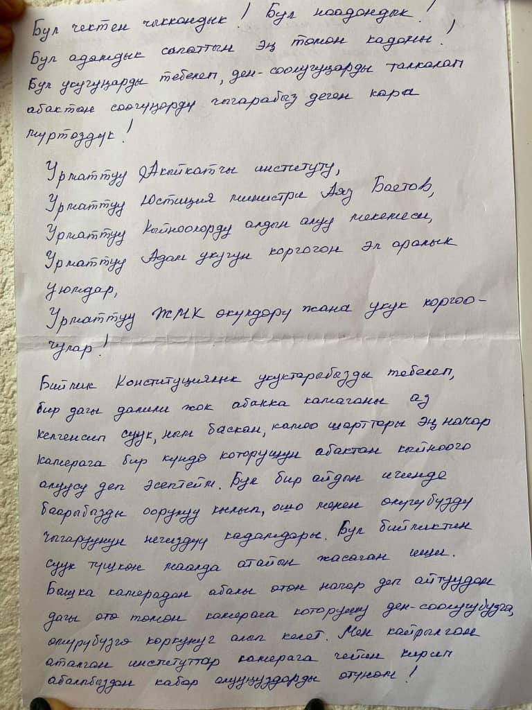 Башка камерадан абалы өтө начар деп айтуудан дагы өтө төмөн камерага которушу ден-соолугубузга, өмүрүрүбүзгө коркунуч алып келет. Мен кайрылган аталган институттар камерага чейин кирип, абалыбызды кабар алууңуздарды өтүнөм», - деп жазылган кайрылууда.