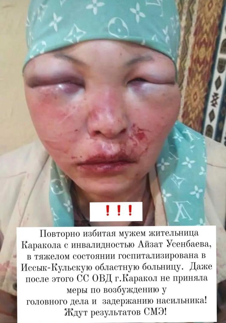 Окуя тууралуу алгач 15-майда караколдук укук коргоочу Камил Рузиев жазып чыккан. Ал майыптыгы бар, ооруканага оор абалда түшкөн Айзат Үсөнбаева буга чейин да күйөөсүнүн ур-токмогуна кабылганын билдирген.