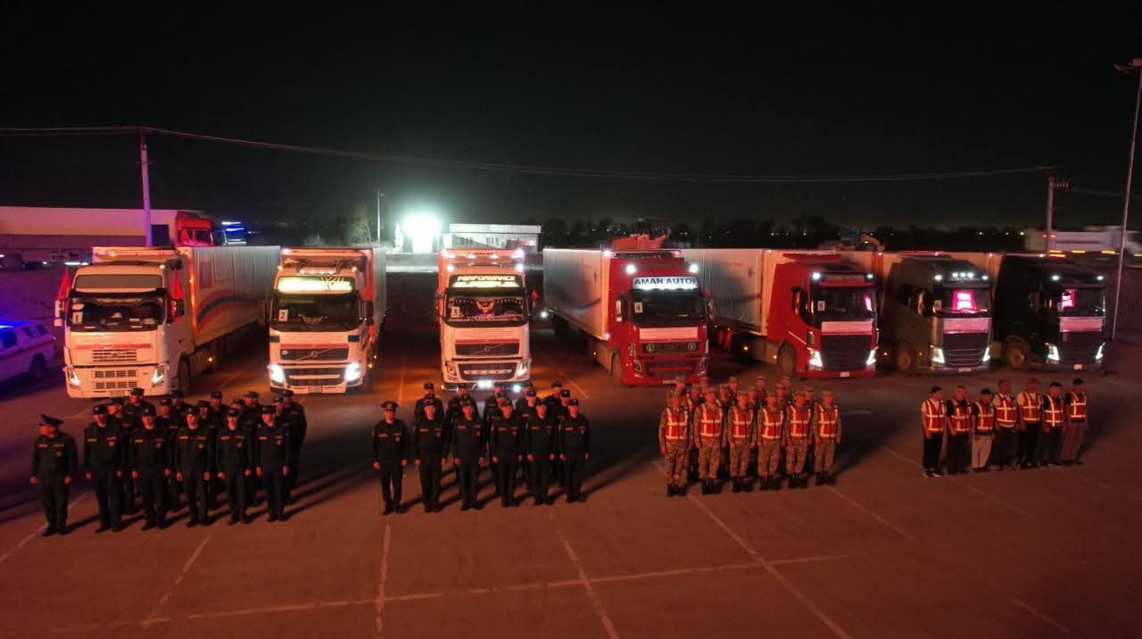 Жалпы салмагы 129 тоннаны түзгөн гуманитардык жардамдын ичинде ун, эт консервалары, өсүмдүк майы жана керектүү дары-дармек каражаттары ӨКМдин жети оор жүк ташуучу унаалар колоннасына жүктөлүп, Иран Ислам Республикасына жеткирүүгө жөнөтүлдү.