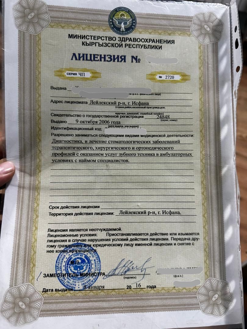 Маалыматка ылайык, УКМК тарабынан Кылмыш-жаза кодексинин 379-беренесинин 2-бөлүгүндө (Документтердин жасалмасын жасоо) каралган кылмыштын негизинде козголгон кылмыш ишинин алкагында Лейлек районунун Раззаков шаарында жасалма лицензиянын негизинде мыйзамсыз иштеп жаткан стоматологиялык борбордун ишмердүүлүгү токтотулду.