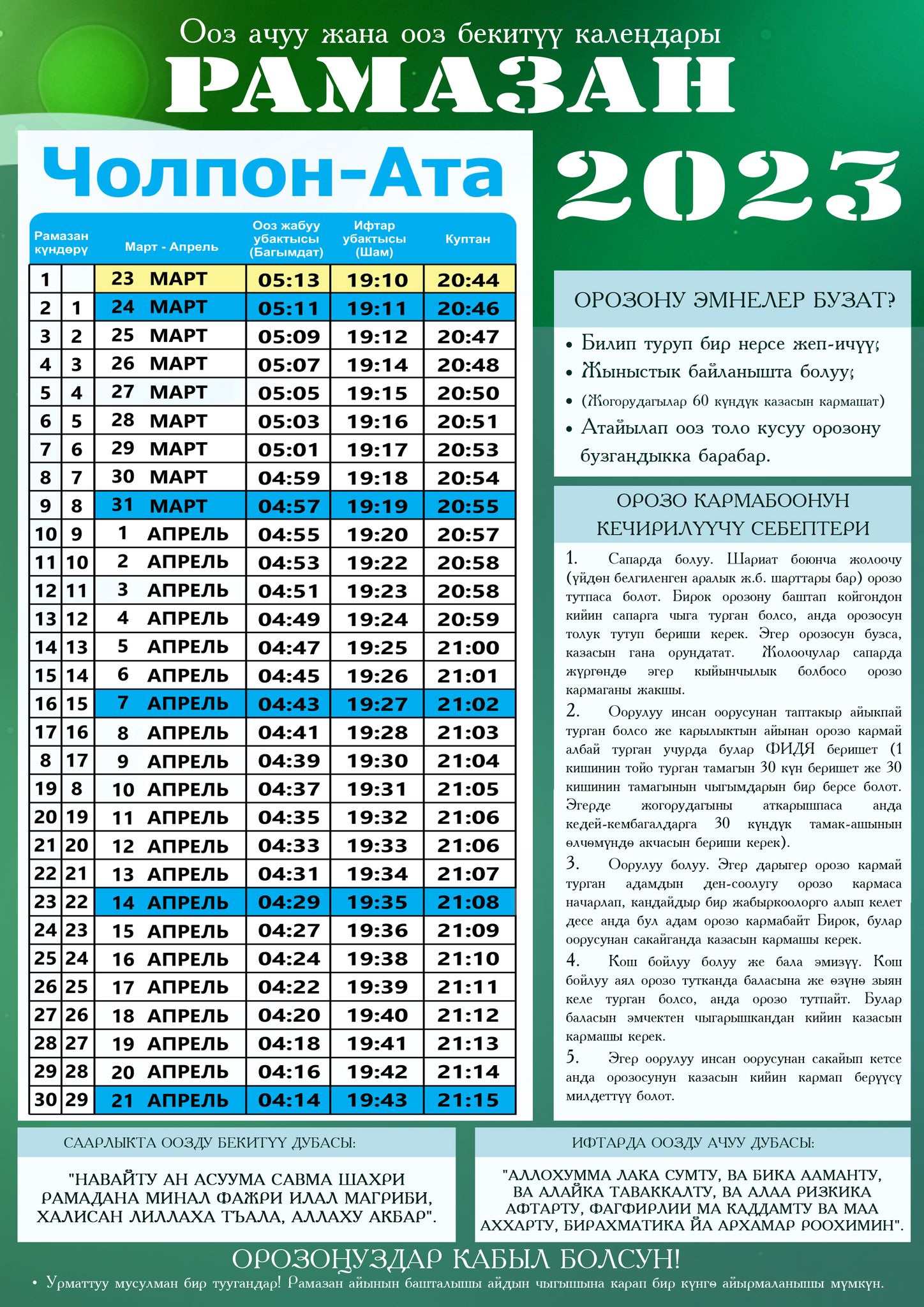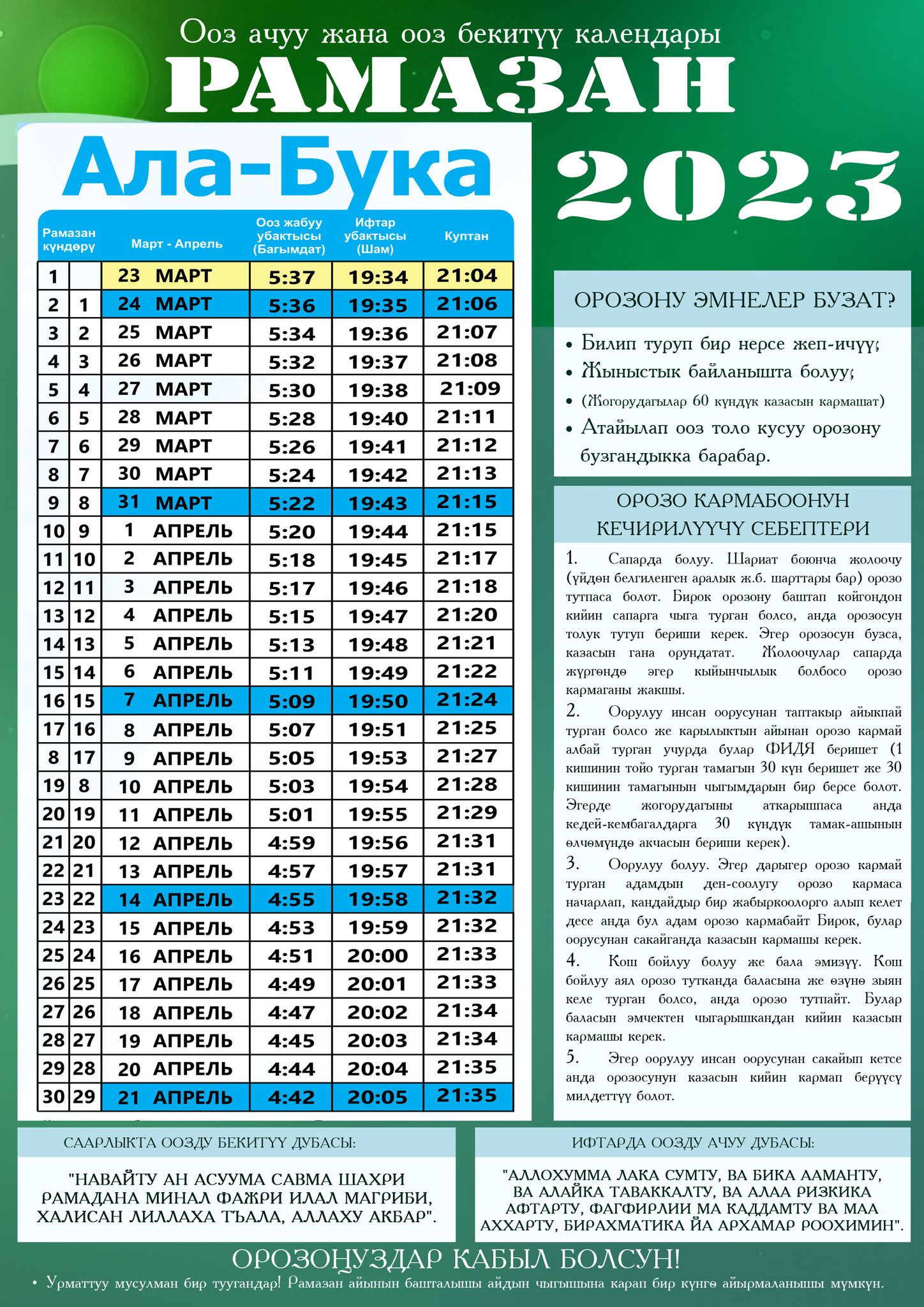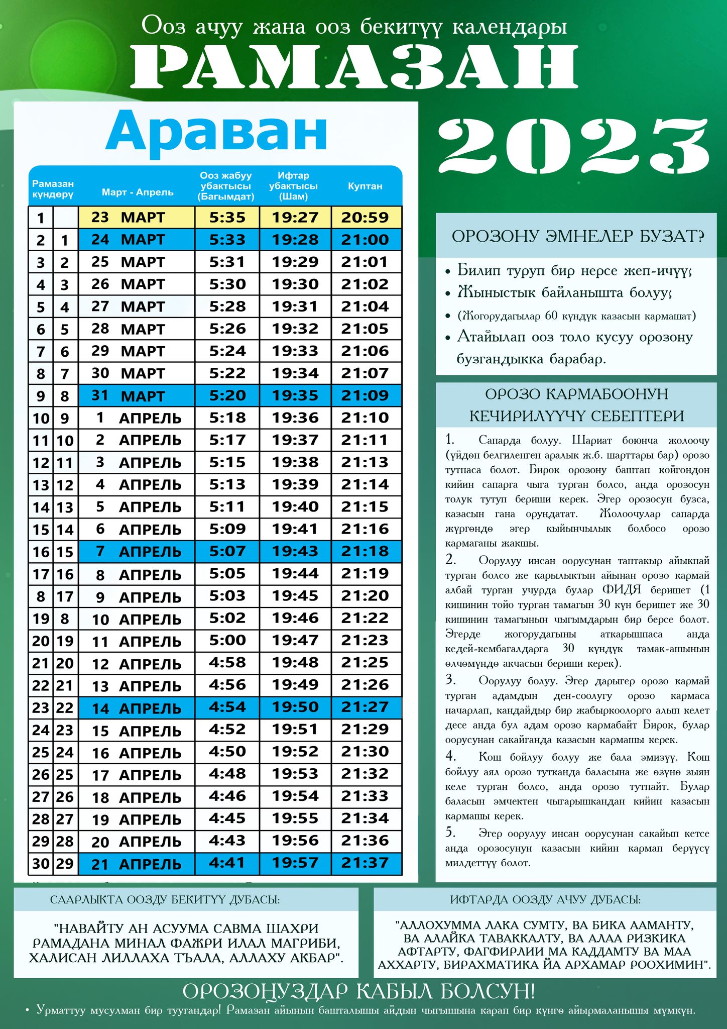 2023-жылдагы Орозо айы 23-мартта башталат. 22-мартта өлкө аймагындагы бардык мечиттерде таравих намазы окулат.