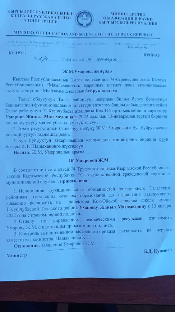 Министрдин №2/4 12.01.22 Көк-Ой орто мектебинин директору Ж.Умарова Талас райондук шаардык Билим берүү бөлүмүнүн башчысы болуп дайындалганга чейин, убактылуу биринчи кол койуу менен жетекчинин милдети жүктөлсүн деп жазылып, кайра тогуз кундон кийин М.Берембаеваны милдетин аткаруудан бошотуу буйругуна (№15/4 21.01.22) табышмактуу себептер менен "Ж.Умарова Талас райоондук, шаардык Билим берүү бөлүмүнүн башчысы болуп дайындалганына байланыштуу» - деп (убактылуу Милдетин аткаруу деген сөз болуш керек эле алынып салынган) жыландын башын кылтыйткан.