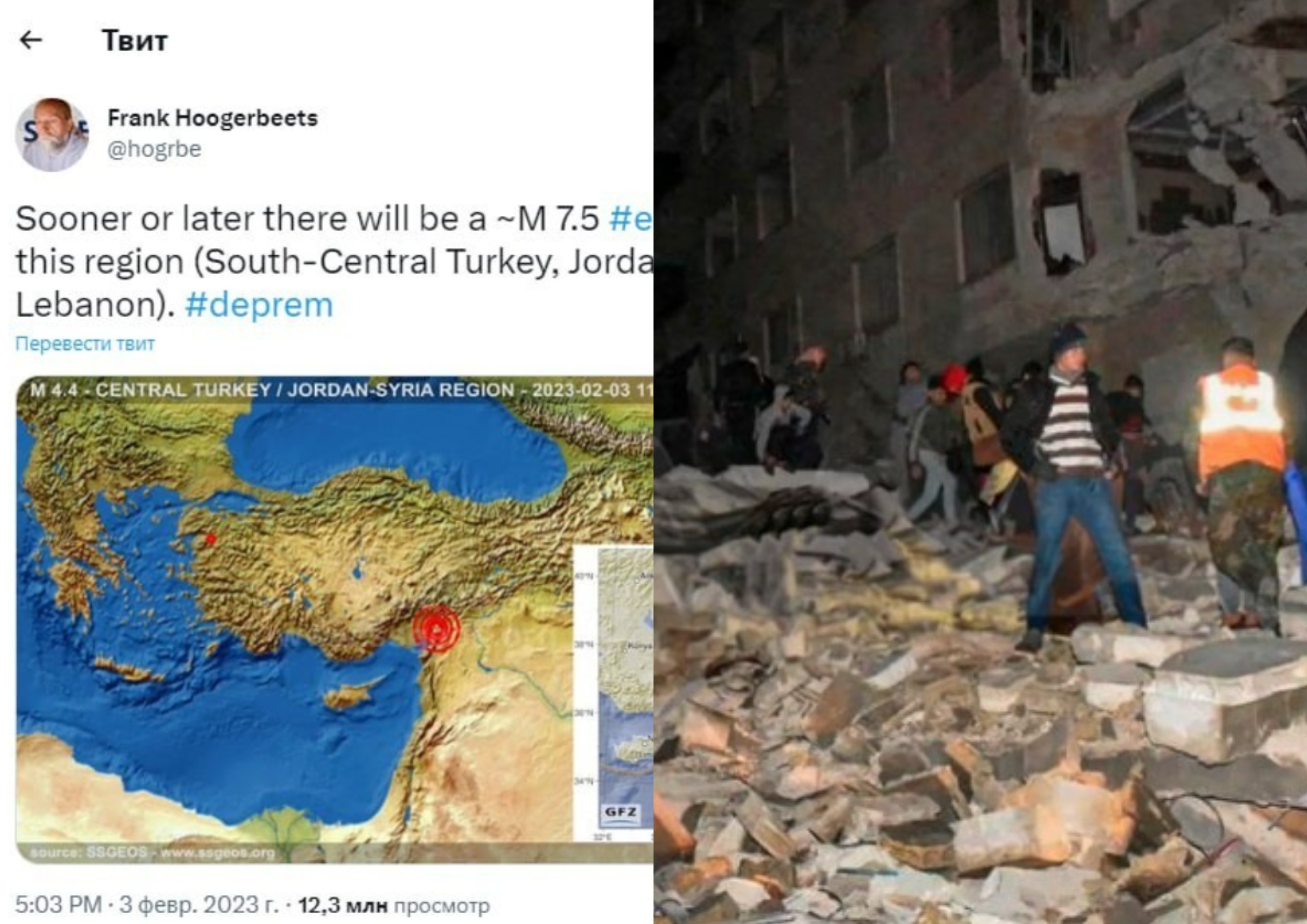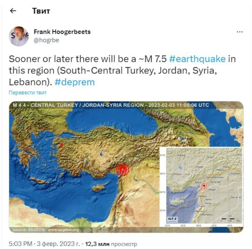 Голландиялык сейсмолог Фрэнк Хогербитс окуядан эки күн мурун Түркиянын Сирия, Иордания жана Ливан менен чектеш түштүк-чыгышында жакынкы бир нече күн ичинде күчү 7,5 баллга жеткен катуу жер титирөө болорун айткан. Бул тууралуу ал өзүнүн Twitter баракчасына жазды.