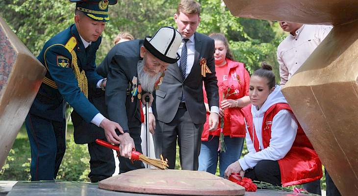 Иш-чаранын алкагында жыйын-реквием өтүп, Улуу Ата Мекендик согуштун ардагери Касымбай Жолдошев мемориалдык комплекстеги Өчпөс отту күйгүздү.