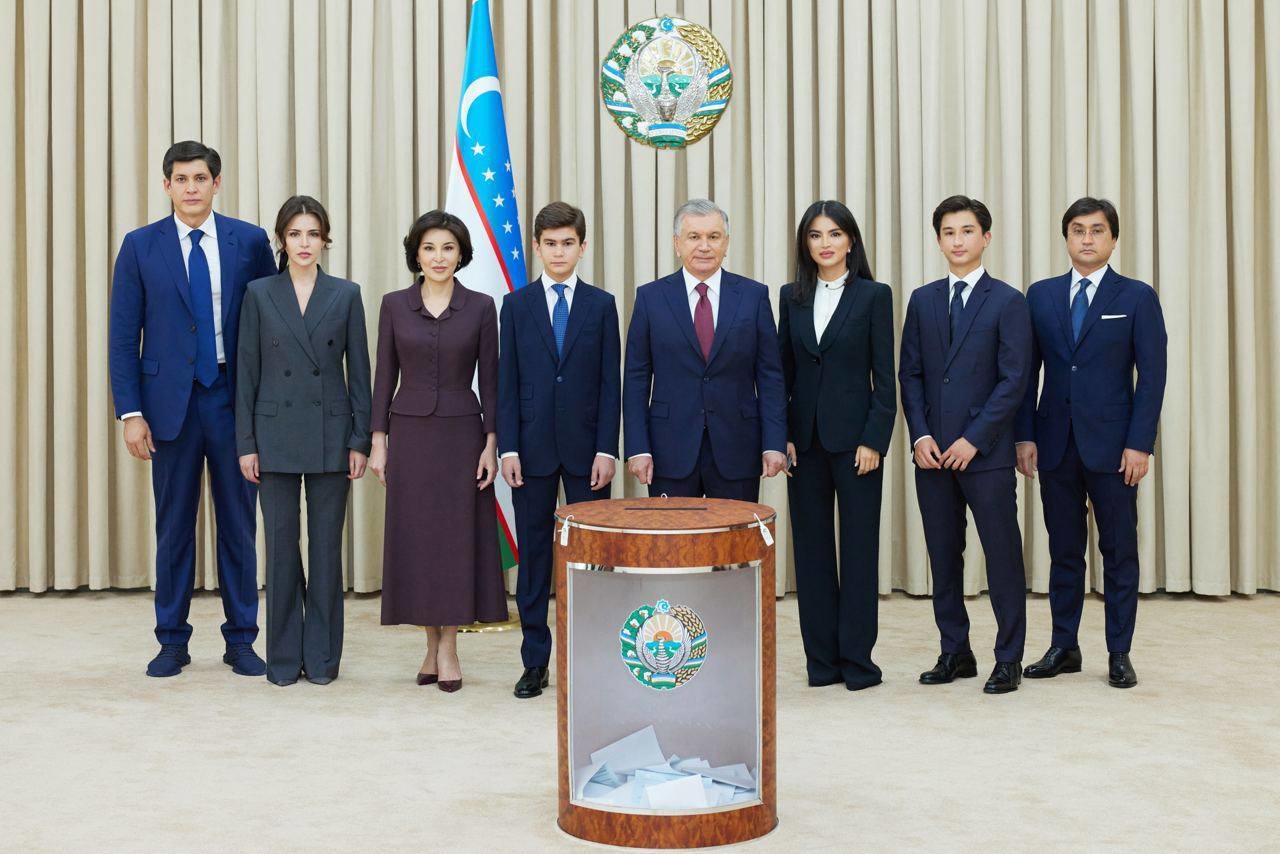 Шавкат Мирзийоевди жубайы, балдары жана неберелери коштоп жүрүшкөн. Президенттикке талапкер добуш бергенден кийин шайлоо участкасына келген жергиликтүү тургундар менен баарлашты.