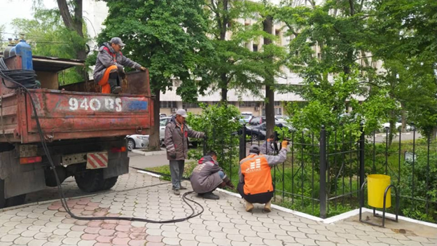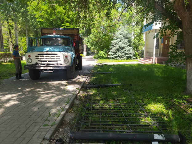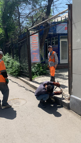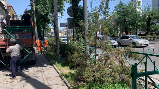 Акимчиликтин кызматкерлери «Тазалык» муниципалдык ишканасынын, №12 жана 13 МАБдын кызматкерлери менен биргеликте мыйзамсыз тосмолорду алууда.