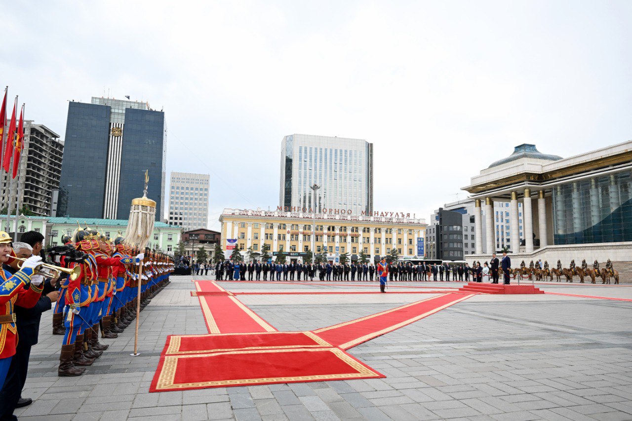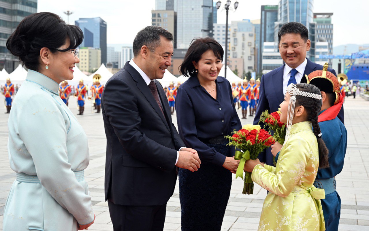 Президент Садыр Жапаровдун кортежи "Сухэ-Батор" аянтындагы Мамлекеттик сарайга келди, ал жерде аны Монголиянын Президенти Ухнаагийн Хурэлсух жубайы Лувсандоржийн Болорцэцэг менен тосуп алды.