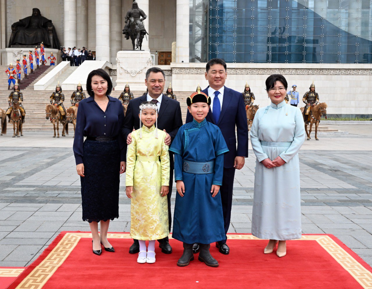 Андан соң мамлекет башчылары жубайлары менен чогуу сүрөткө түштү, Ардактуу кароолдун ротасынын командиринин саламдашуу рапортунан кийин Кыргызстандын жана Монголиянын мамлекеттик гимндери жаңырды. Садыр Жапаров монгол туусун жана Ардактуу кароолду "Салам, аскер!», деп саламдашты.