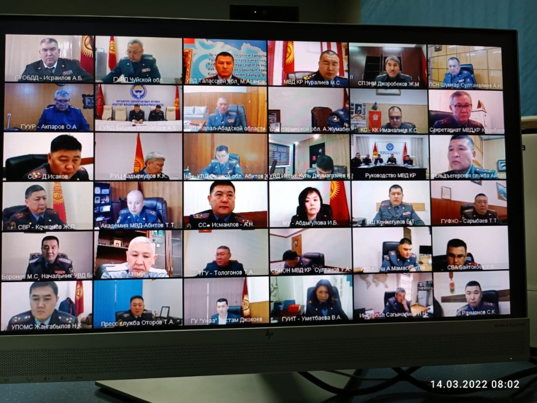 Онлайн режиминде өткөн жыйындын ишине министрдин орун басарлары, ИИМдин Борбордук аппаратынын тиешелүү кызматтарынын, Баткен, Ош, Жалал-Абад, Нарын, Ысык-Көл, Талас, Чүй облустарынын, Бишкек жана Ош шаарларынын ички иштер башкы башкармалыктарынын, башкармалыктарынын жетекчилери катышты.