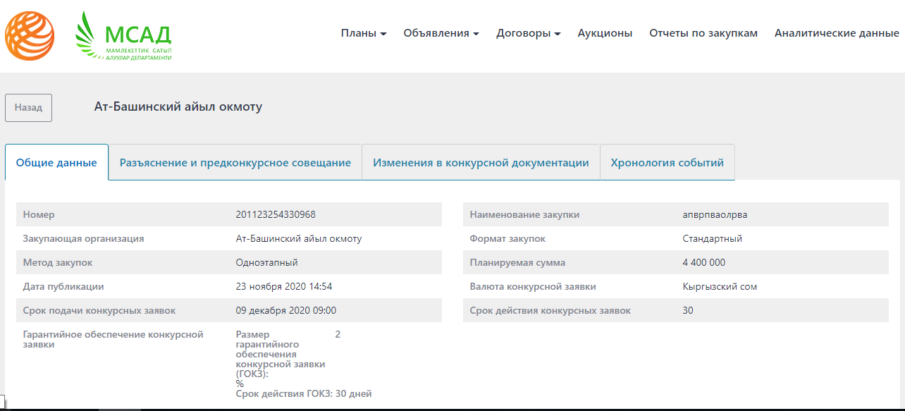 Ат-Башы айыл өкмөтү " апврпваолрва "ны 4,4 миллион сомго сатып алгысы келет. Мындай аталыштагы жарыя мамлекеттик сатып алуулар порталындагы кулактандырууда көрсөтүлгөн.