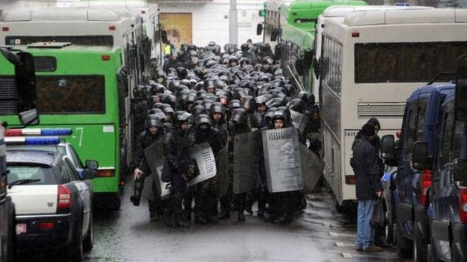 Минскиде коопсуздук чаралары күчөтүлүп, акция өтүп жаткан тарапка бараткан кишилерди милиция кармап, жолдорду бөгөп турду. Канча киши кармалганы тууралуу расмий билдирүү айтылган жок.