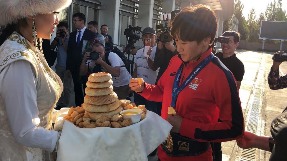 Бүгүн, 21-сентябрда “Манас” аэропортунан кечээ Казакстанда күрөш боюнча Дүйнө чемпиондугун утуп алган Айсулуу Тыныбекованы Кыргыз Республикасынын президентинин аппаратынын башчысы Досалы Эсеналиев, вице-премьер-министр Замирбек Аскаров, Бишкек шаарынын вице-мэри Айгүл Рыскулова баш болгон бийлик өкүлдөрү, журналисттер жана Айсулуунун күйөрмандары тосуп алышты.