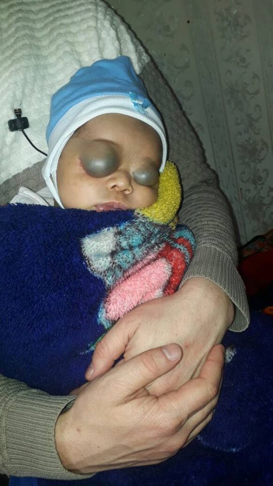 "Жардамыңыздаар керек! Бул наристе Нуркамилов Мубарак, төрөлгөнүнө эми 30 кун болду. Төрөлгөндө көздөрү ушундай болуп төрөлгөн.