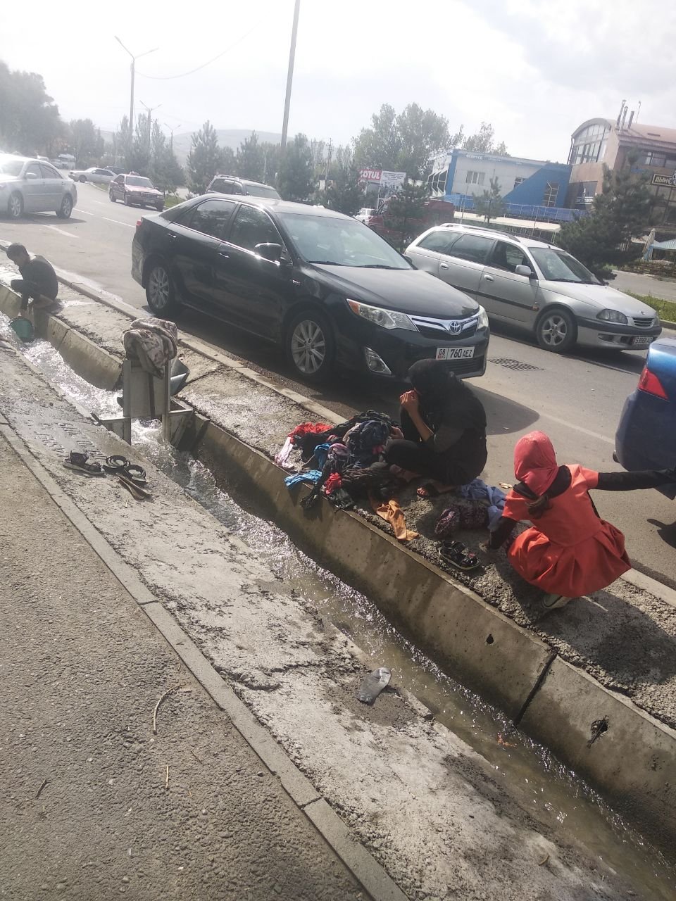 Жол боюндагы арыкта кир жууп жатышкан жаш кыздарды Бишкек шаарынын тургуну сүрөткө тартып алган.