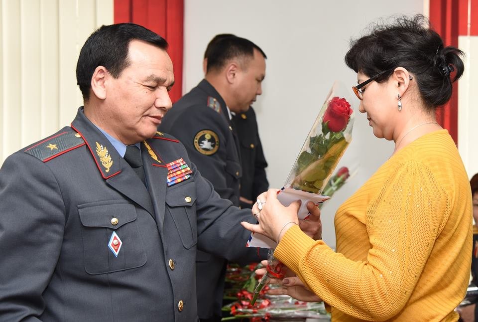 Жолугушуунун жүрүшүндө, министр милиция кызматкерлеринин жесирлерине жана кызматкер аялдарга гүлдөр менен кошо түзүмдүк сыйлыктарды тапшырды.