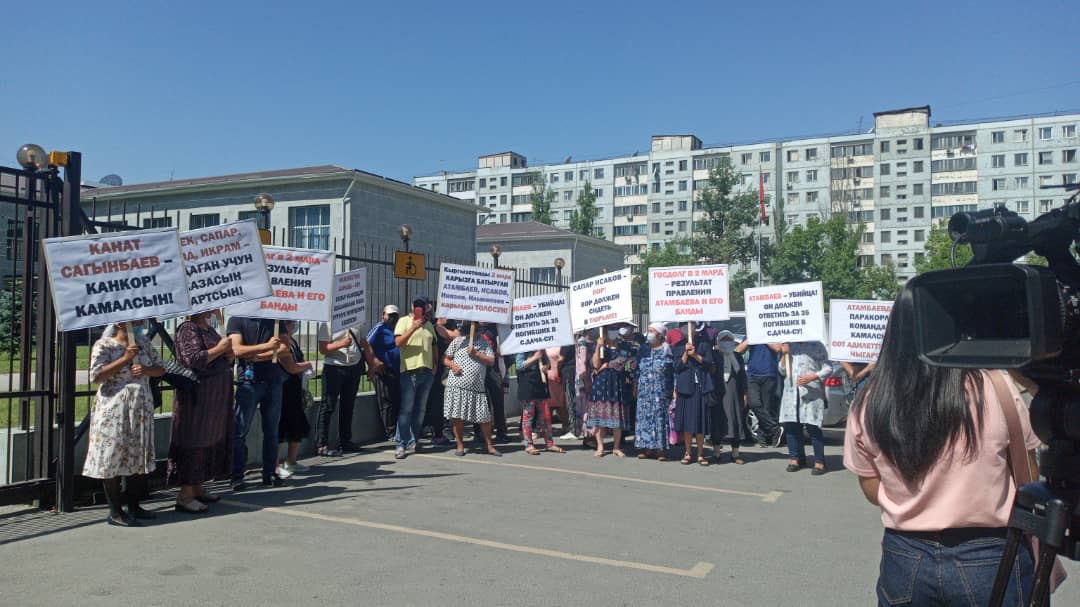"Сот имаратынын жанында мурунку мамлекет башчысына жана анын командасына каршы митинг өтүүдө. Митингчилер Алмазбек Атамбаевди, Сапар Исаковду, Фарид Ниязовду, Икрамжан Илмияновду кылмыш жоопкерчилигине тартууну талап кылышып, "Атамбаев карызды төлөсүн, камалсын!", - деген үндөрдү айтышууда.