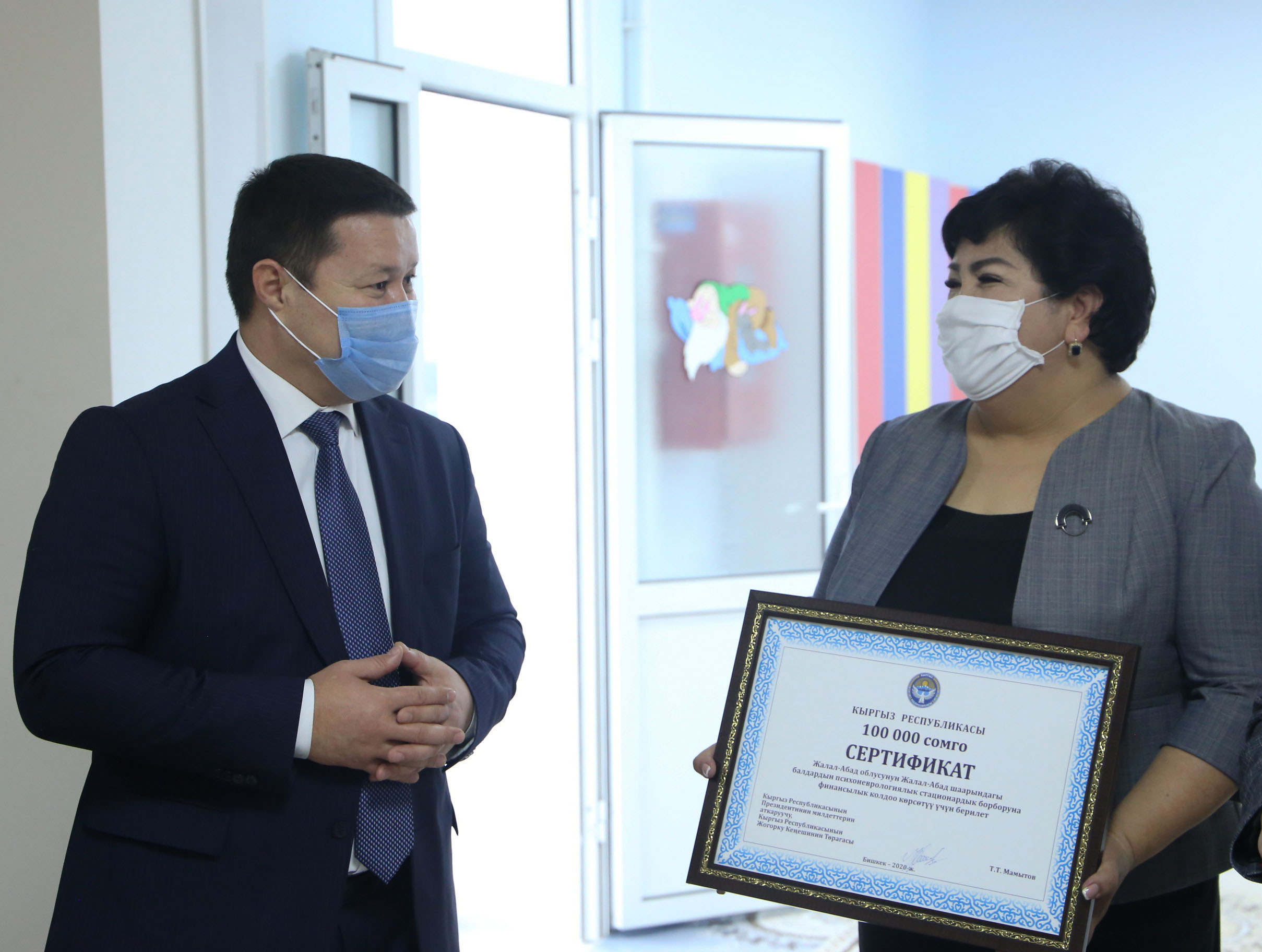Каржы жагынан колдоо көрсөтүү максатында, Жалал-Абад балдар психоневрологиялык социалдык стационарынын жетекчилигине 100 миң сомдук сертификат тапшырылды.