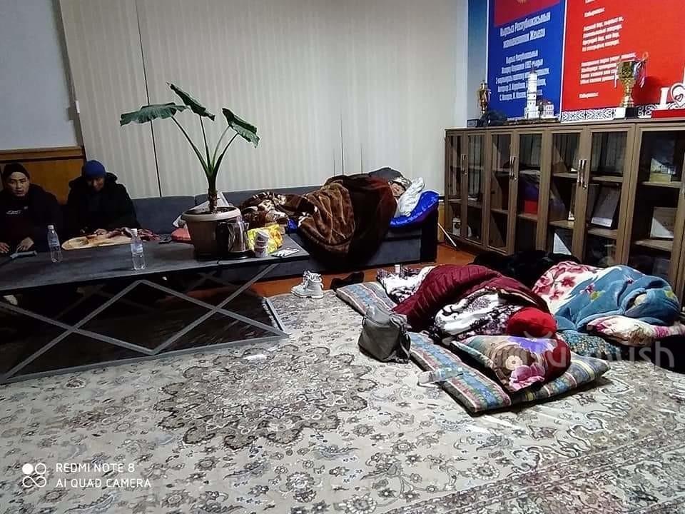 Шаар башчысы Нурбек Молдокадыров алар менен бир нече ирет сүйлөшүүгө аракет кылганы менен нааразы болгон топ анын сөзүнө макул болгон жок. Кечээ, 30-декабрда кечинде үйлөрүнөн алып келген жууркан-төшөктөрдү иш бөлмөгө салып, жатып алышты.