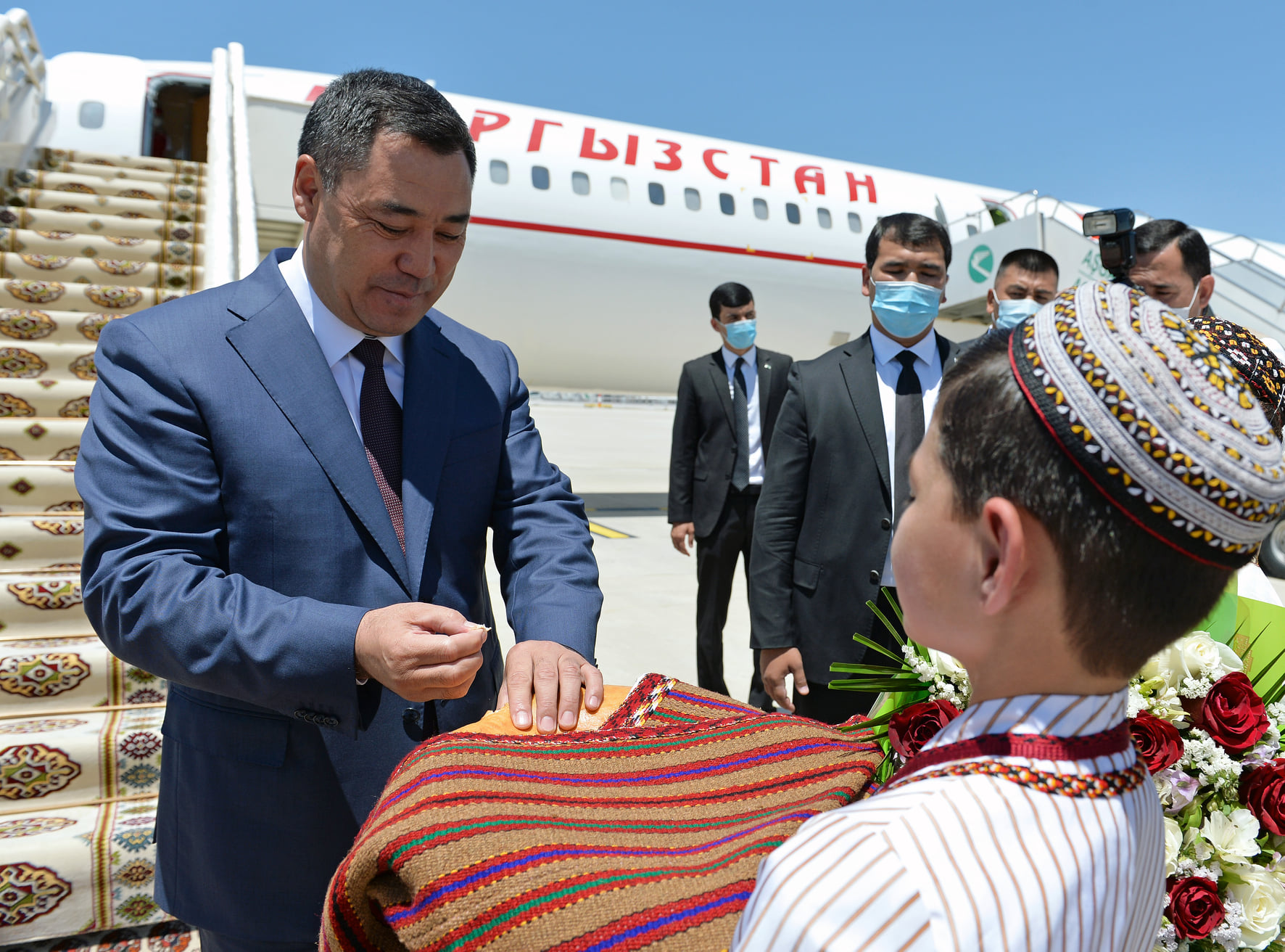 Мамлекет башчысынын учагы Ахшабад шаарындагы эл аралык аэропортко конуп, Садыр Жапаровду траптан Түркмөнстандын энергетика министри Чарымурад Пурчеков тосуп алды.