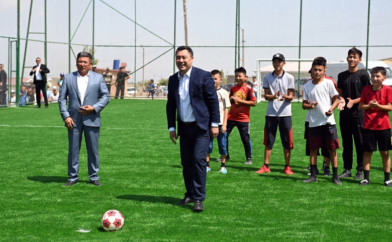 Оңдолгон мектептин футбол талаасын жана спорт залын кароо учурунда мамлекет башчы айылдын жаштар командасы менен футбол жана волейбол ойноду.
