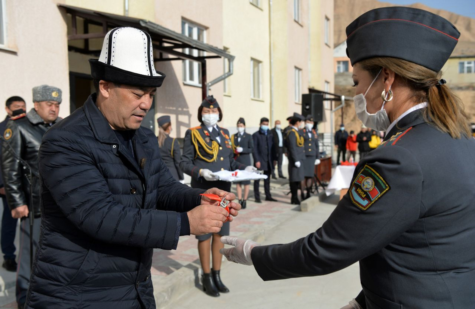 Жапаров Нарын облусуна жумушчу сапарынын алкагында Нарын шаарында укук коргоо органдарынын кызматкерлери үчүн курулган көп батирлүү турак-жайдын ачылыш аземине катышты.
