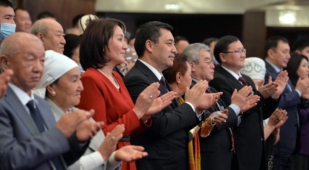 Концертке өлкө башчы Садыр Жапаров жубайы Айгүл Жапарова менен келип, сахна чеберлеринин өнөр кечесине күбө болуп кайтты.