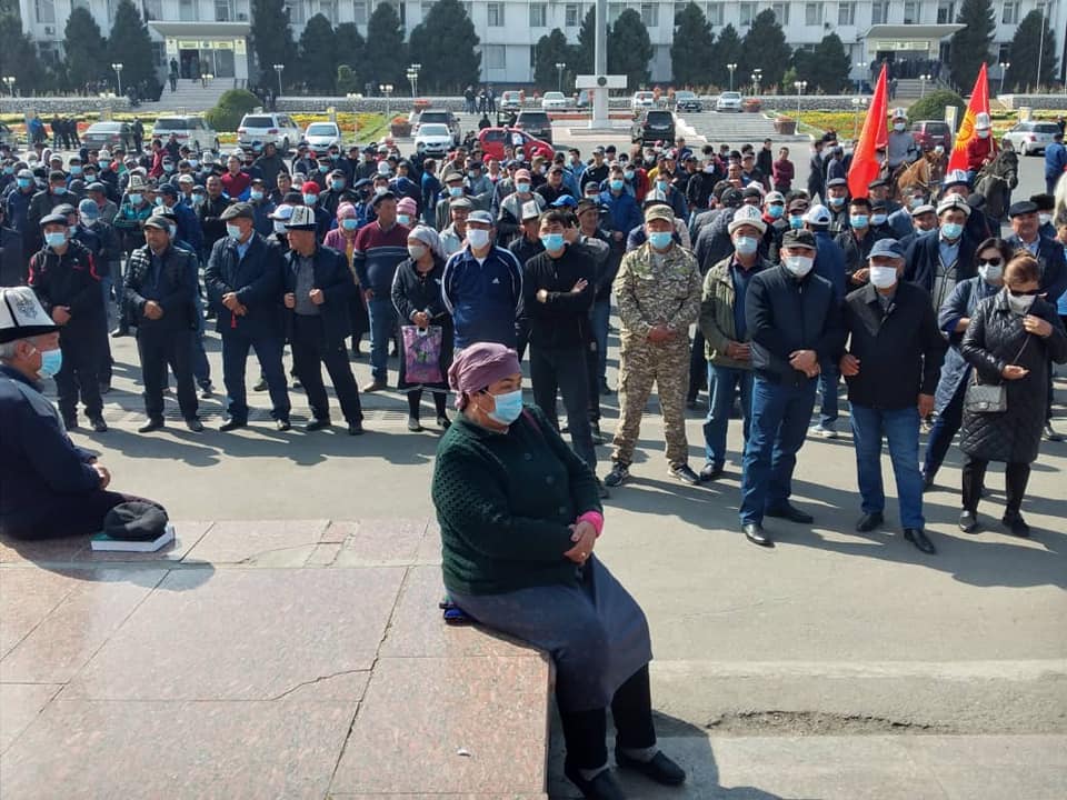 Ош шаарынын бобордук аянтында президент Сооронбай Жээнбековду колдоо митинги өтүп жатат. Алар "Сооронбай Жээнбеков Сизге ишенген элиңиз бар аркаңызда!", "Энелер тынчтык үчүн" деп плакаттарга жазып колдоруна кармап турушат.