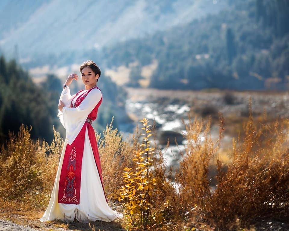Кадрлардан балбан жаратылыш койнунда улуттук колориттеги көйнөк менен сүрөткө түшкөнүн көрүүгө болот.