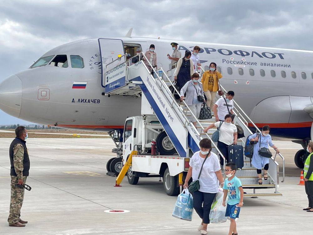 Москвадан Лихачев атындагы Airbus A320 учагы менен 79 жүргүнчү учуп келген. Адаттагыдай учакты "триумф аркасы" — суу аркасы менен тосуп алышканы айтылат.