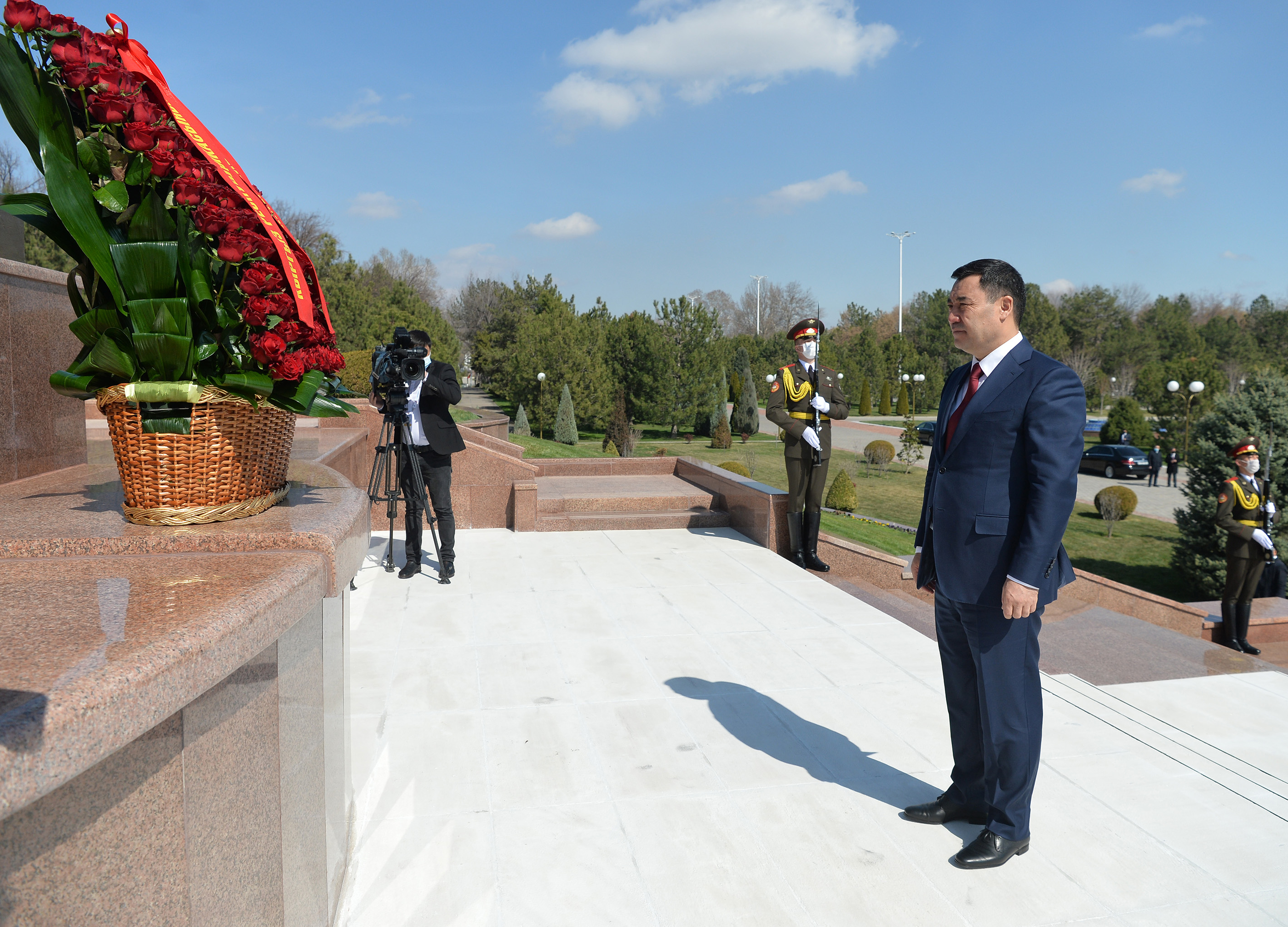 Президенттин аппаратынын маалыматтык саясат бөлүмү билдиргендей, мамлекет башчысы ардактуу кароол ротасынын жоокерлеринин коштоосунда монументке гүл койду.