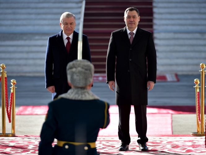 Андан ары Садыр Жапаров менен Шавкат Мирзиёев өздөрүнүн расмий делегация мүчөлөрүн тааныштырышты, андан соң мамлекет башчыларынын алдынан Ардак кароол ротасынын жоокерлери салтанаттуу марш менен өтүштү.