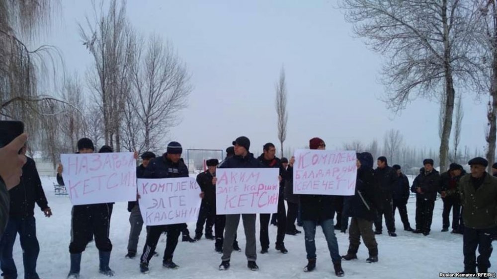 Нааразылык акциясына чогулгандар “Аким элге каршы, кетсин!”, “Комплекстин жоюлушуна каршыбыз” деген жазуусу бар плакаттарды кармап турушат. Алар комплекстин жоюлушуна Сузак районунун акими Эрмек Омошев кызыкчылыгы бар экенин айтып, анын кызматтан кетишин талап кылышты.