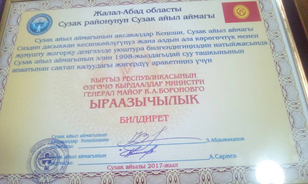 Бул тууралуу ӨКМнин басма сөз кызматы билдирди. Билдирүүгө караганда, Сузак айыл аймагынын аксакалдар Кеңеши министр Кубатбек Бороновго 1998-жылдагыдай суу ташкынынын апаатынан сактап калгандыгы үчүн ыраазычылык катын жолдошкон. Катта министрдин дасыккан кесипкөйлүгү, алдын ала көрөгөчтүк менен жумушту аткара билгендиги баса белгиленген.